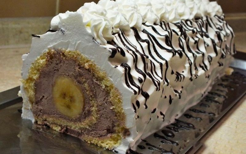Die Bananen mit Zitronensaft beträufeln, um ein Bräunen zu verhindern. Die abgekühlte Schokosahne mit einem Handrührgerät schlagen und auf den Kuchen streichen. Die Bananen darauf legen und zusammenrollen.