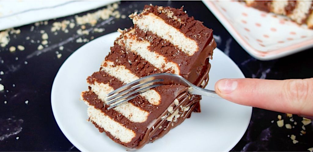 Um es zuzubereiten, beginnen wir mit der Ganache, basierend auf Schokolade, frischer Sahne, nach etwa 1 Stunde Ruhezeit im Gefrierschrank mit einem elektrischen Schneebesen aufschlagen. Dann nehmen wir die trockenen, vorzugsweise rechteckigen Kekse, füllen sie mit Ganache, formen daraus eine Fliese, dekorieren sie mit weiterer Ganache, Haselnusscreme und gehackten Haselnüssen und servieren.Butter und