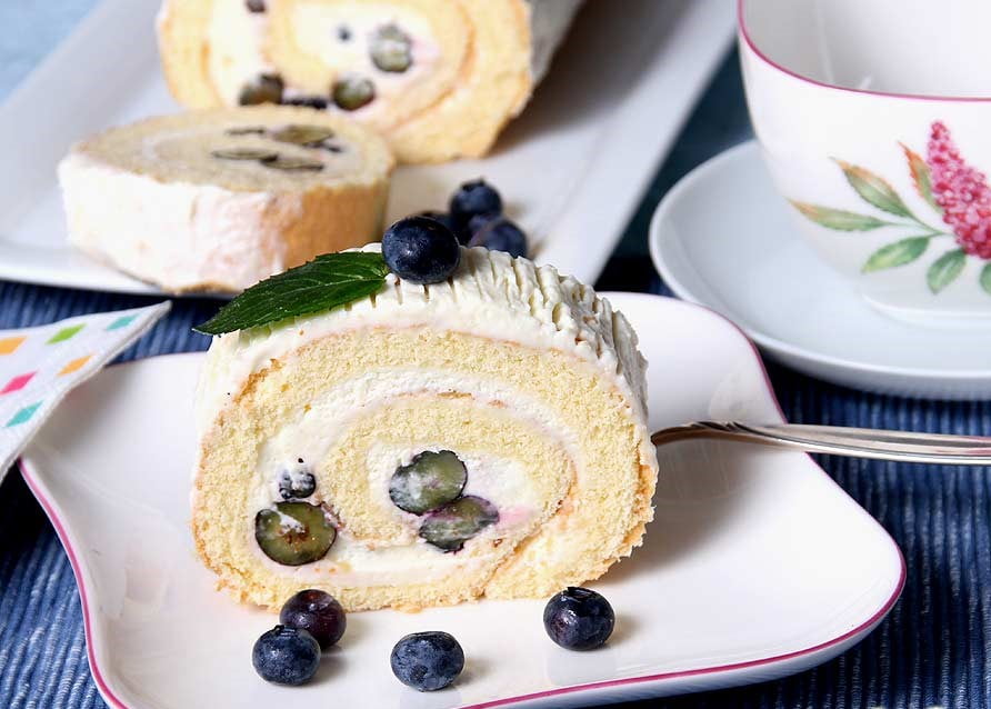 Die gefüllte Biskuitrolle mit Heidelbeeren bis zum Servieren nochmals gut im Kühlschrank durchziehen lassen.