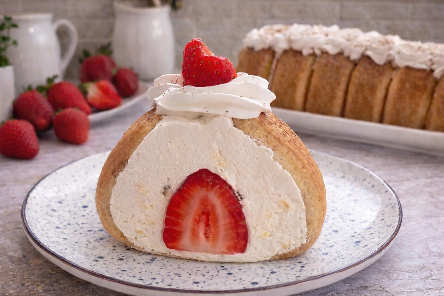 Die Folie entfernen und die Rolle oben mit Schlagsahne oder Schlagrahm sowie frischen Erdbeeren dekorieren.