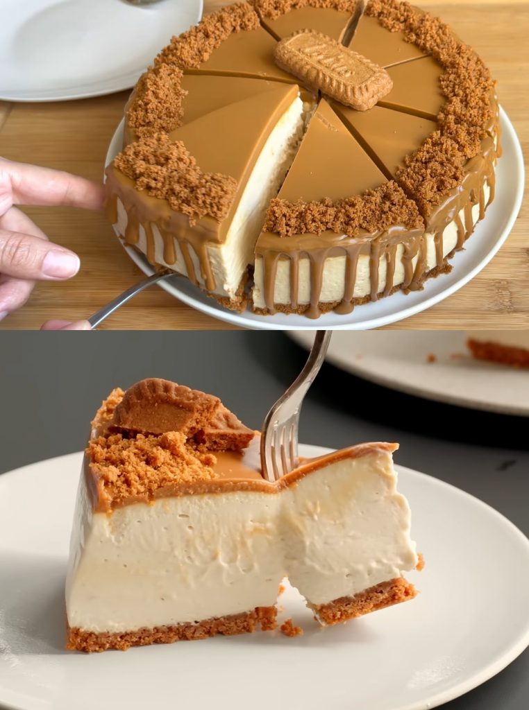Nun die Creme auf dem Keksboden verteilen und den Käsekuchen ohne Backen mindestens 4 Stunden in den Kühlschrank stellen, damit die Masse fest wird. Mit geschmolzenem Lotus Brotaufstrich verzieren.
