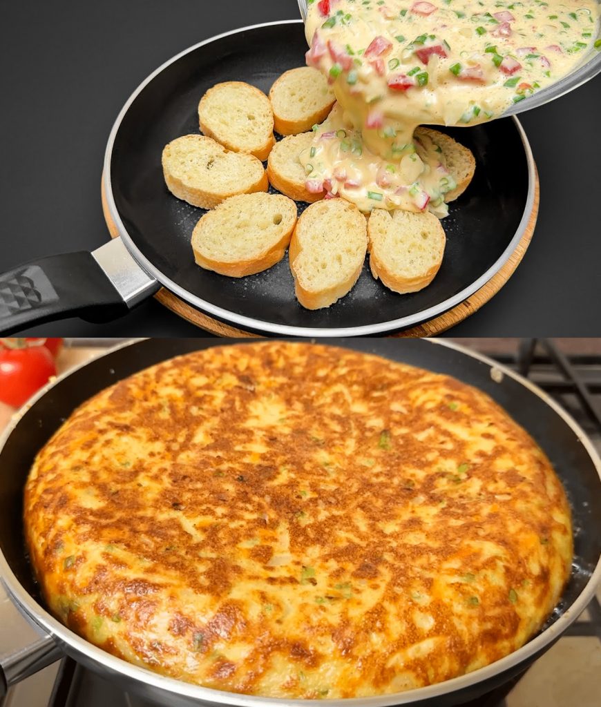 Den Boden einer großen Pfanne mit Brot aufstellen, leicht gefetteten Kasserolle mit 3 der Eier bedecken und bei mittlerer Hitze braten bis sie gestockt sind.