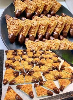 Anschließend aus dem Ofen nehmen und etwas abkühlen lassen. Wenn sie noch leicht warm sind in gleich große Quadrate schneiden und danach die Quadrate in Dreiecke schneiden.