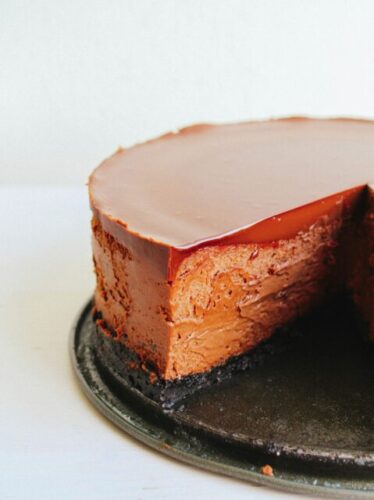 Ein **intensiver dunkler Schokoladen-Cheesecake** mit knusprigem Schokoladen-Haselnussboden und glänzender Schokoladen-Haselnuss-Ganache – perfekt für echte Schokoladenliebhaber.