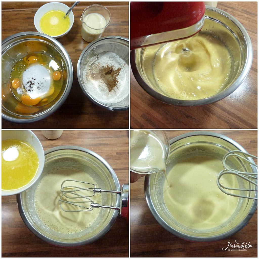 Mehl, Backpulver, Zimt und Muskat miteinander vermischen. Zucker und Eier in einer Schüssel mit dem Mixgerät oder der Küchenmaschine bei hoher Stufe so lange aufschlagen, bis sich eine helle Masse gebildet und das Volumen sich verdoppelt hat. Das Mixgerät etwas langsamer stellen und die Vanille und die zerlassene Butter in dünnem Strahl hinzufügen und einarbeiten. Dabei nicht zu lange rühren, damit die Luftigkeit der Eimasse nicht verloren geht. Anschließend den Eggnog unterziehen. Nun die Mehlmischung in drei Portionen mit einem Teigschaber unterheben.