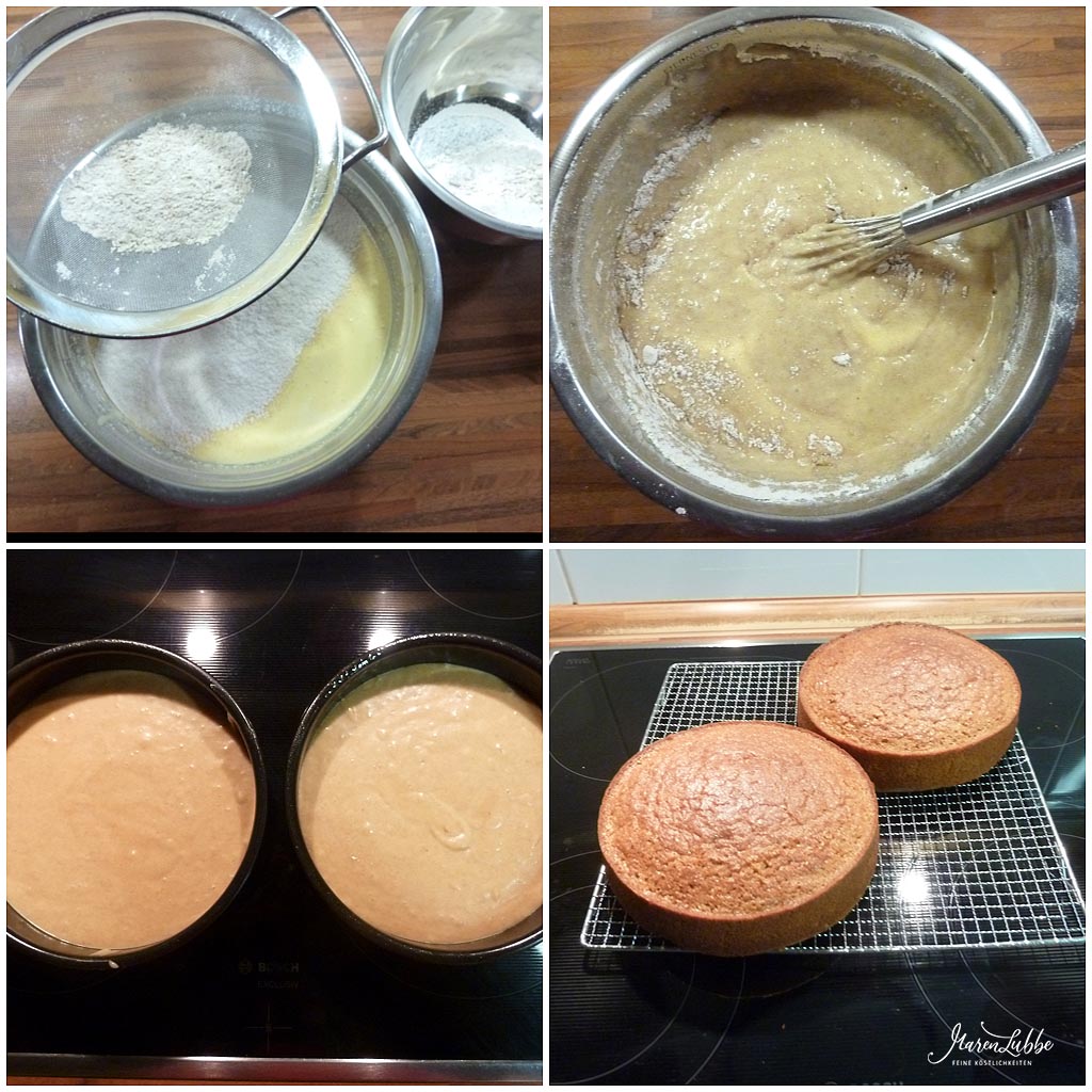 Den Teig zu gleichen Teilen in die beiden vorbereiteten Formen füllen und ca. 30 bis 40 Minuten backen (Stäbchenprobe machen). Danach auf einem Kuchengitter vollständig abkühlen lassen.