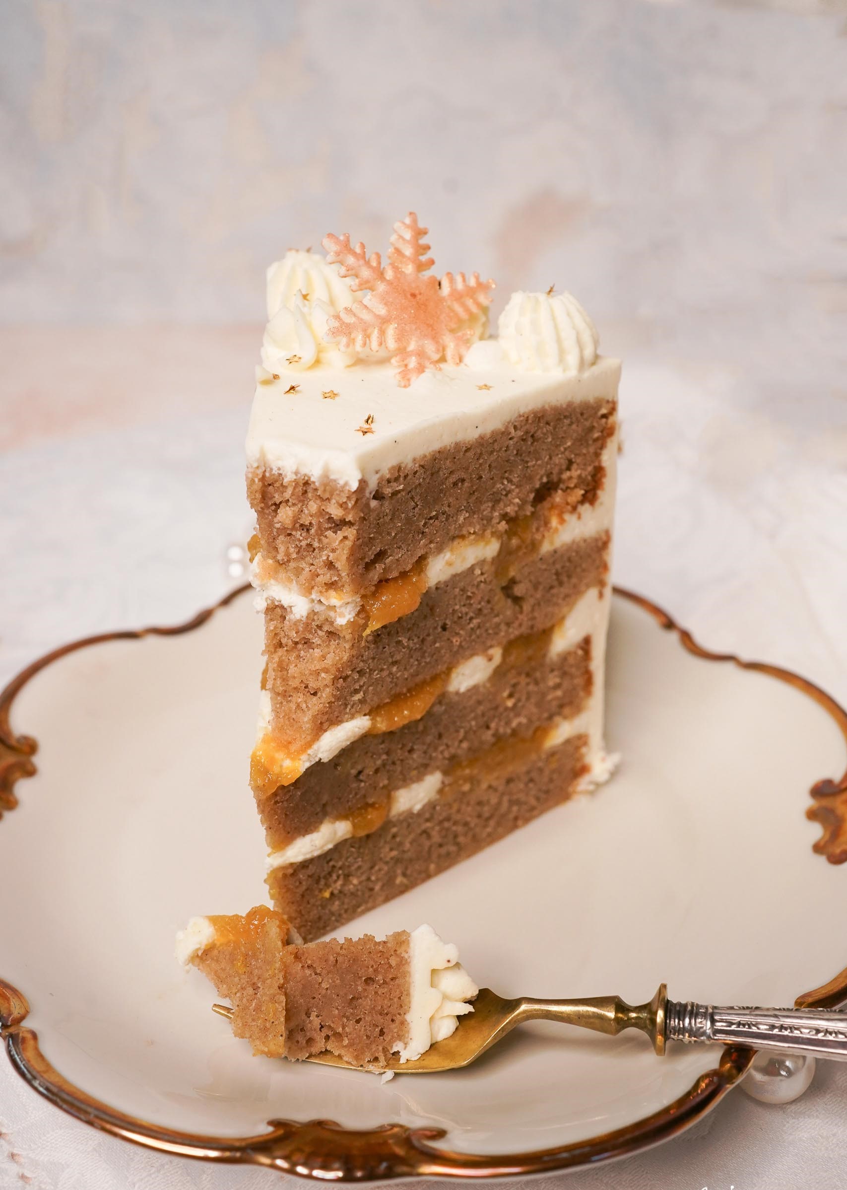 Mit der Sahne einen Kreis am Außenrand des Bodens spritzen, sowie noch zwei weitere kleiner werdende Kreise. Die Zwischenräume der Sahnekreise üppig mit Orangen Marmellata befüllen. Den zweiten Boden ebenfalls mit etwas Eggnog bestreichen und auflegen. Erneut wie zuvor beschrieben mit Sahne und Orangen Marmellata bespritzen. So auch bei der dritten Schicht verfahren. Zum Schluss den vierten Boden auflegen und die gesamte Torte dünn mit Sahne bestreichen. Die Torte nun für eine halbe Stunde in den Kühlschrank stellen. Danach erneut mit Sahne einstreichen und mithilfe eines Spritzbeutels mit Sterntülle nach Wunsch dekorieren.
