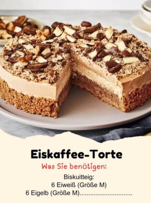 4. Sahne mit Sahnesteif und Vanillin-Zucker fast steif schlagen. Eiskaffeepulver einrieseln lassen und steif schlagen. Creme auf den Boden streichen und mind. 1 Std. kühlen.