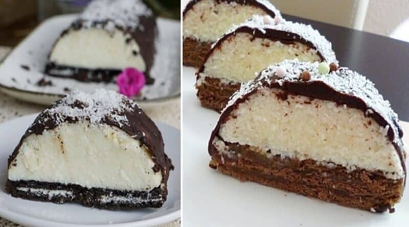 Mit Kokosraspeln bestreuen und dekorieren. Den Kuchen im Kühlschrank aufbewahren.