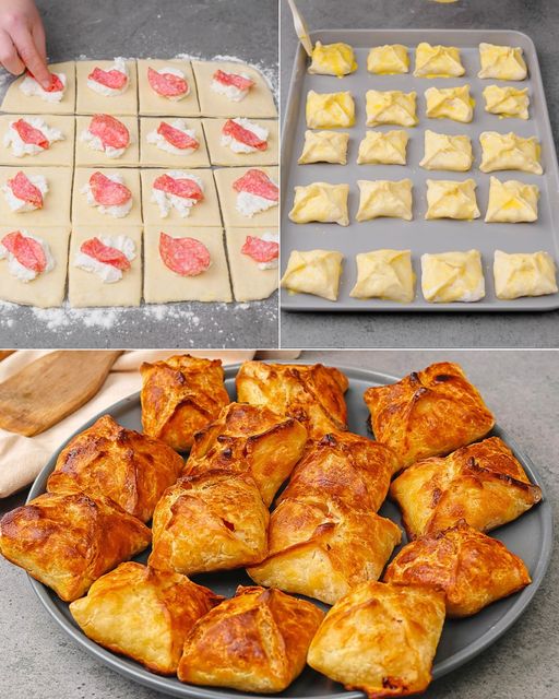 Die Knödel mit Ricotta und Salami sind weiche und leckere Vorspeisen, ideal als leckere Vorspeise , für ein Buffet oder einen Aperitif . Für die Zubereitung haben wir den Teig mit Wasser, Mehl, Ei, Eiweiß und Salz zubereitet ; Anschließend muss die Masse ruhen, bevor sie ausgerollt, mit zerlassener Butter bestrichen und erneut ausgerollt wird, sodass anschließend Quadrate entstehen, die mit Ricotta und Salami gefüllt werden . Dann einfach wie ein Päckchen verschließen, mit dem Eigelb bestreichen und im Ofen etwa 20 Minuten goldbraun backen. Hier sind die Schritte, um sie vorzubereiten.