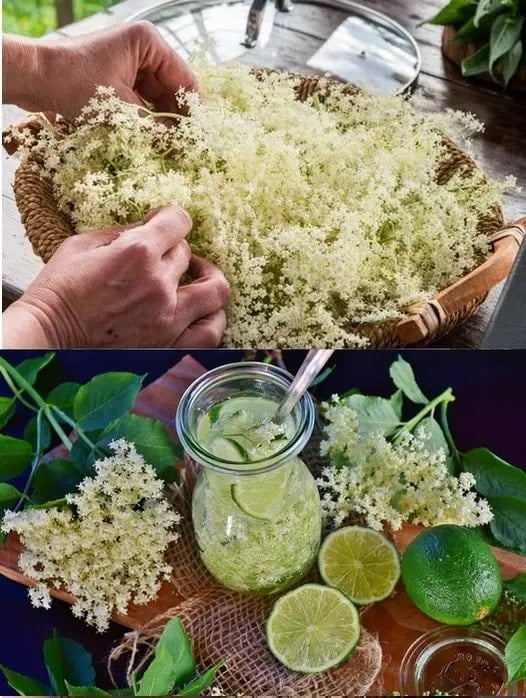 20 frische Holunderblüten in 1 Liter kaltem Wasser einweichen.