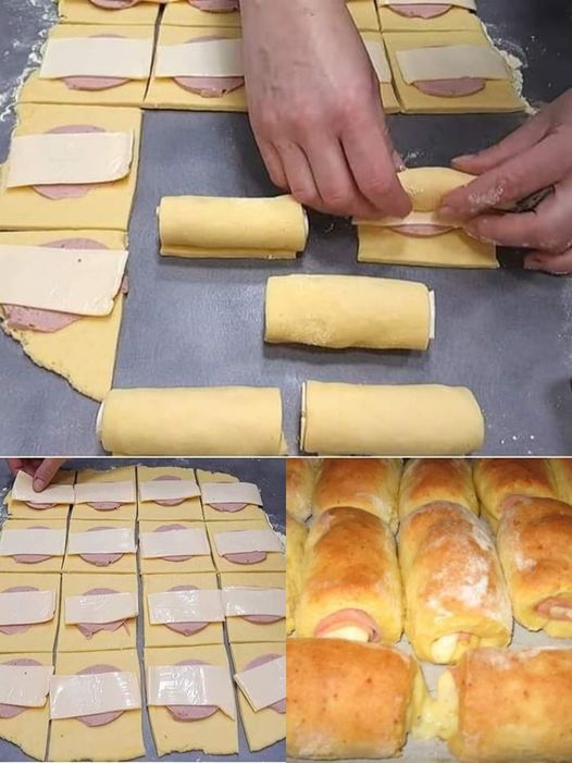 Legen Sie Käse und Schinken auf die geschnittenen Quadrate und rollen Sie sie ein.
