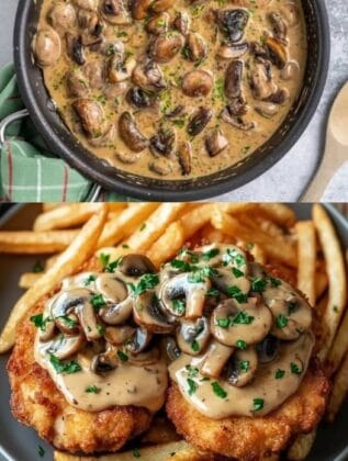 Vor dem Servieren die Jägersoße mit frischen Champignons mit fein gehackter Petersilie bestreuen..