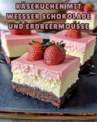 Dieser Käsekuchen kombiniert eine samtige weiße Schokoladenfüllung mit einer leichten Erdbeer-Mousse-Schicht – perfekt für besondere Anlässe!