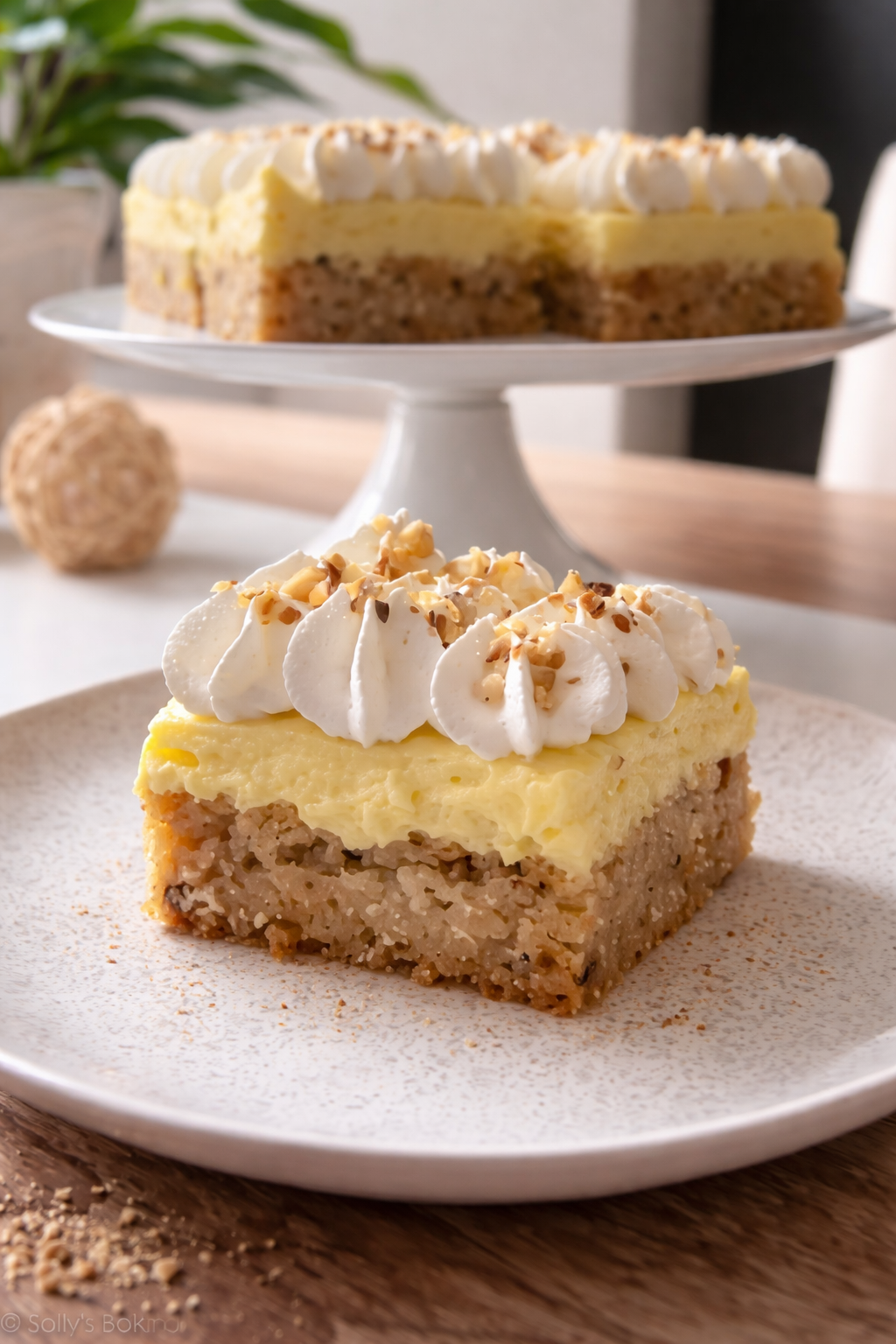 Feiner Biskuit **ohne Mehl**, eine luftige Vanillecreme und obenauf Schlagsahne 👌