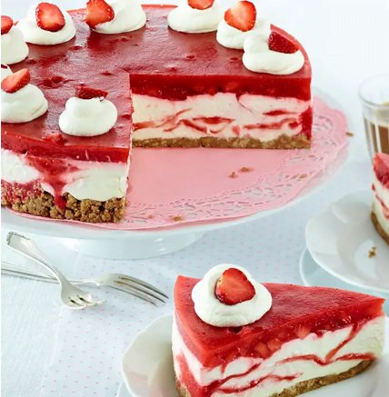 5 Blatt Gelatine in kaltem Wasser einweichen. Dann ausdrücken und bei schwacher Hitze auflösen. Erst 3 EL des übrigen Erdbeerpürees einrühren, dann unter den Rest Püree rühren. Die Erdbeerwürfel auf der Torte verteilen und das Püree daraufgießen.