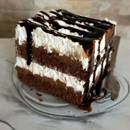 Den ersten Boden mit Milch tränken, mit der Hälfte der ersten Creme bestreichen, dann die Hälfte der zweiten Creme darauf verteilen. Mit dem zweiten Boden abdecken, ebenfalls mit Milch tränken und zuerst die restliche erste Creme, dann die restliche zweite Creme darauf verteilen.