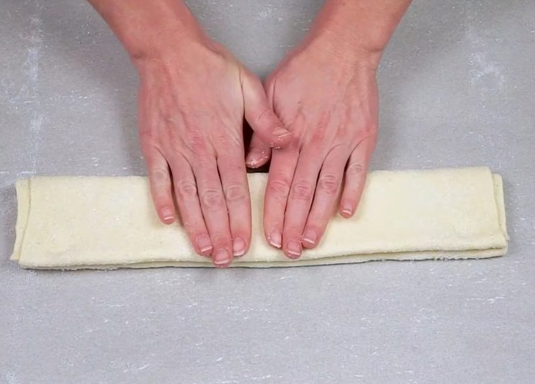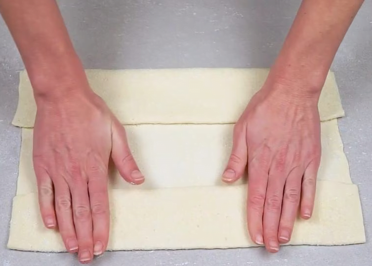 Fold them again so the two folds meet exactly at the middle of the dough. Then fold one half over the other half and press gently like closing a book.