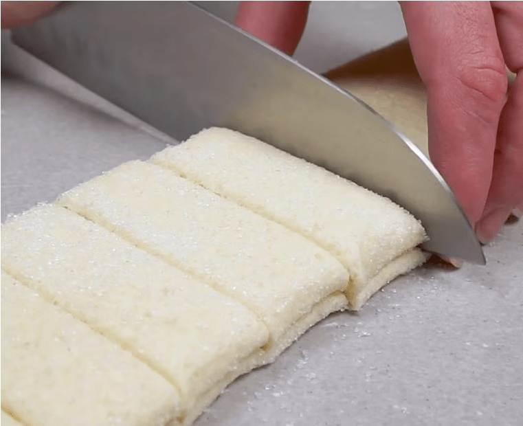 Beat the dough with a flat part of the knife and slice into 1,5 cm (3/4 inch) wide strips.