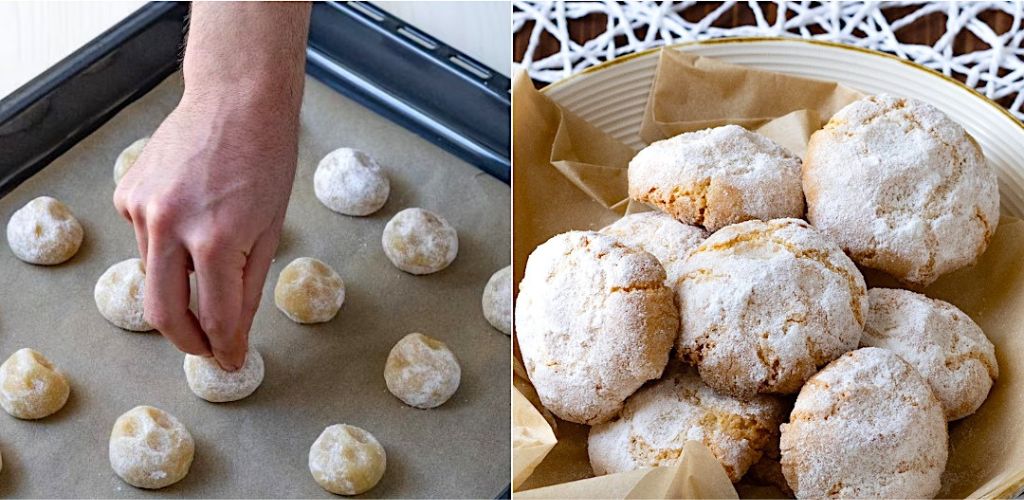 Nach Ablauf der Ruhezeit die Mandelbällchen auf ein mit Backpapier ausgelegtes Backblech legen und mit den Fingern „einklemmen“, sodass sie ihre charakteristische Form erhalten.6. Bei 180°C backen und etwa 12 Minuten garen.