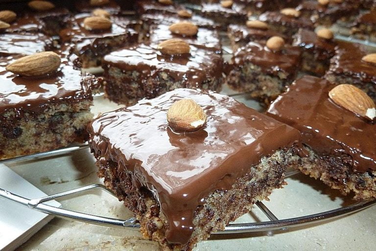 Noch warm in ca. 4 x 4 cm große Stücke schneiden, auf dem Blech erkalten lassen und mit der Schokoladenglasur überziehen. Mit den ganzen Mandeln dekorieren.