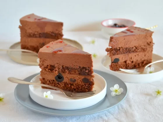 Schokomousse-Torte mit Amarenakirschen 3 Stück auf Teller