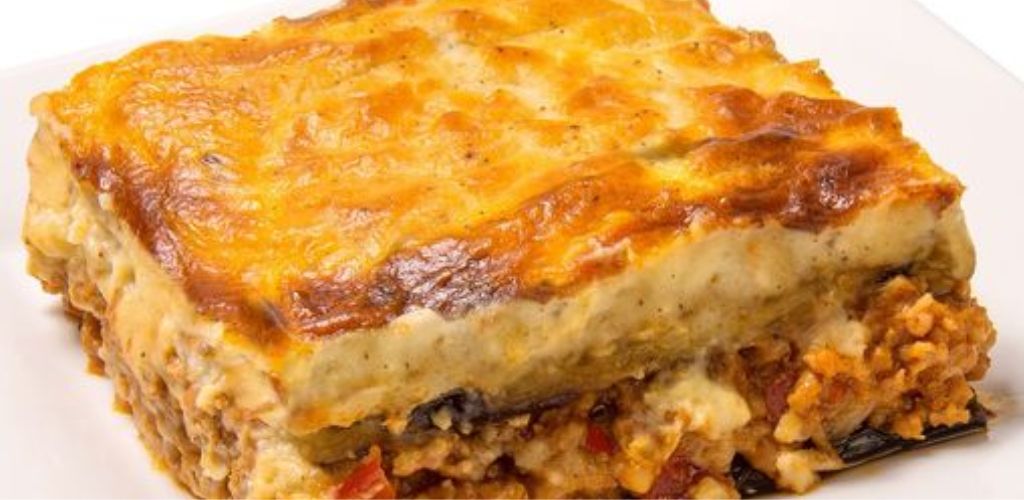 4-5 Esslöffel der Béchamelsauce zur Fleischmasse geben und verrühren. Die Kartoffeln in eine ofenfeste Form schichten, dann die Hälfte der Auberginen darauf schichten. Gießen Sie die Fleischmischung. Die restlichen Auberginen schichten und mit der Béchamelsauce übergießen. Etwas Parmesan darüber reiben.