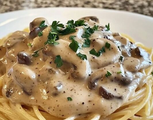 Jetzt die Sahne eingießen und alles einmal aufkochen lassen. Mit Salz und Pfeffer abschmecken. Die fertig gekochten Spaghetti abgießen, zur Sauce in die Pfanne geben und alles gut vermengen. Zum Schluss mit frisch gehackter Petersilie bestreuen und direkt servieren. Guten Appetit!