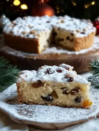Servieren Sie den Stollenkuchen in Portionen, bestäubt mit Puderzucker. Er passt hervorragend zu einer Tasse Kaffee oder Tee.