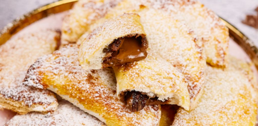 Brottaschen mit Eigelb bestreichen und etwas Zucker darüber streuen. 15 Minuten backen. Sofort servieren, mit Puderzucker bestäubt.