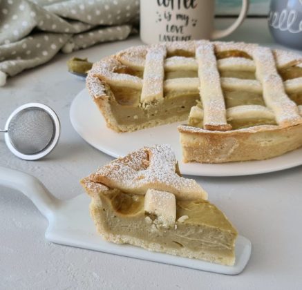 Per realizzare questa golosa crostata con crema pasticcera al pistacchio serve prima preparare la pasta frolla. Potete impastare il tutto a mano in una ciotola oppure utilizzando qualsiasi robot di cucina. Io per comodità ho utilizzato la planetaria. Nella ciotola della planetaria aggiungere la farina e la fecola setacciata, il pizzico di sale, l’essenza alla vaniglia, il lievito per dolci e il burro tagliato a cubetti e impastare utilizzando la frusta a foglia cioè la K a velocità 2 per qualche minuto ottenendo un impasto sabbioso. Unire le uova e lo zucchero a velo e impastare ancora per qualche minuto ottenendo un impasto compatto e omogeneo. Compattare per bene la pasta frolla, avvolgerla nella pellicola per alimenti e metterla in frigo per un’ora circa. Nel frattempo preparare la crema pasticcera al pistacchio. Mettere il latte in un pentolino e adagiarlo sul fuoco a riscaldare. In una ciotola con una frusta sbattete le uova con lo zucchero. Aggiungete poi la farina e amalgamare per bene. Versare il composto di uova nel latte e portate ad ebollizione girando continuamente con la frusta per evitare che si formino dei grumi e far addensare. Togliere dal fuoco e aggiungere la crema spalmabile al pistacchio e amalgamare con cura. Adagiare la pellicola per alimenti a contatto e lasciare raffreddare. Riprendere la pasta frolla dal frigo, lavorarla un po’ con le mani e su una spianatoia infarinata utilizzando un mattarello, stendere una sfoglia di 3-4 mm circa e rivestire una teglia da crostata da 20-22 cm precedentemente imburrata e infarinata. Farcire la base con la crema pasticcera al pistacchio e decorare la superficie con strisce di pasta frolla. Cuocere in forno caldo statico a 170º era 40-45. Spegnere, sfornare e lasciare raffreddare. Adagiare la crostata con crema pasticcera al pistacchio piatto da portata e servire con una spolverata di zucchero a velo. Spero vi piaccia questa mia ultima ricetta, alla prossima amici.