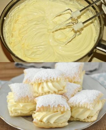 3. Zuletzt die gebackenen Blätterteigschnitten halbieren, die untere Hälfte mit der Creme füllen, den Deckel eventuell mit Puderzucker bestäuben und auf die Creme setzen. Geht super schnell und schmeck Himmlisch !