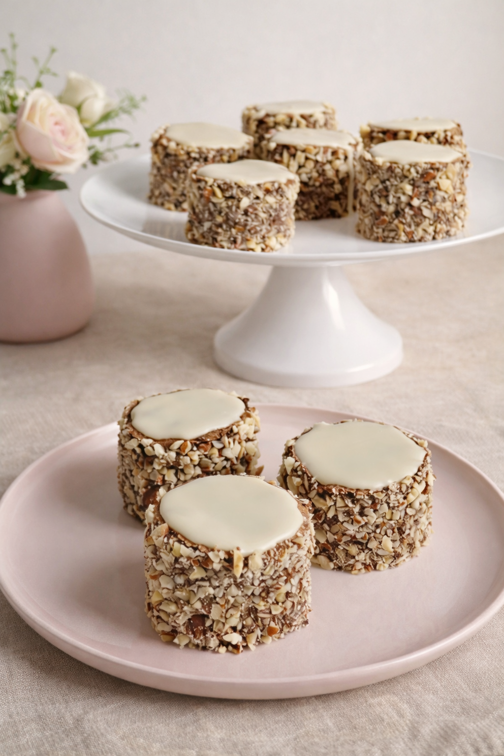 Die Törtchen rundherum mit der Creme bestreichen und in gemahlenen Haselnüssen wälzen.