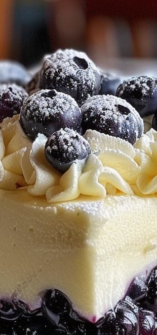 Schritt 3: Den Schichtvorgang mit der restlichen Zitronenmousse und dem Heidelbeerkompott wiederholen und mit einer Schicht Heidelbeerkompott oben abschließen.